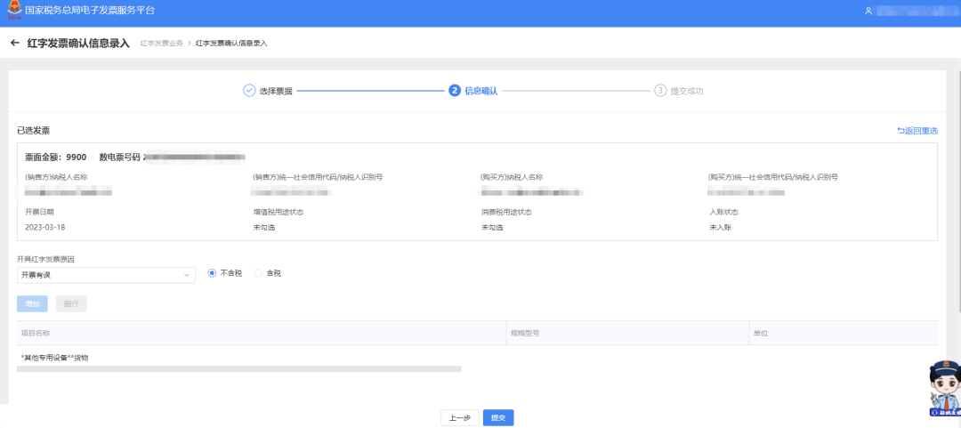 3.查询到需要红冲的蓝字发票后,点击右侧对应的“选择”按钮,进入“②信息确认”页面,需要冲红的蓝字发票信息会自动带入。