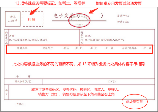 “全电发票”长什么样?全电发票和传统发票一样,同样分为增值税专用发票和普通发票,其效力和纸质版的发票效力一致。其发票样式如下:其中,特殊业务包括但不限于稀土、卷烟、建筑服务、旅客运输服务、货物运输服务、不动产销售、不动产经营租赁服务、农产品收购、光伏
